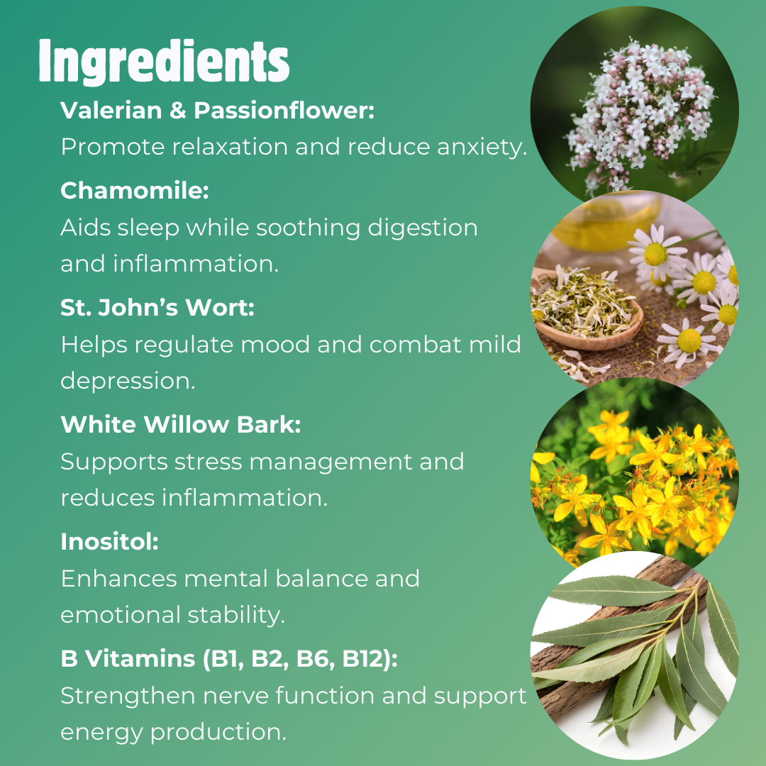 Reducción de ansiedad y estrés: La valeriana, la manzanilla y la pasiflora calman el sistema nervioso, promoviendo la relajación sin causar somnolencia.