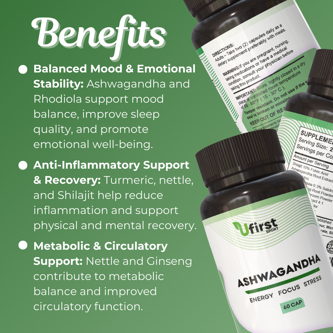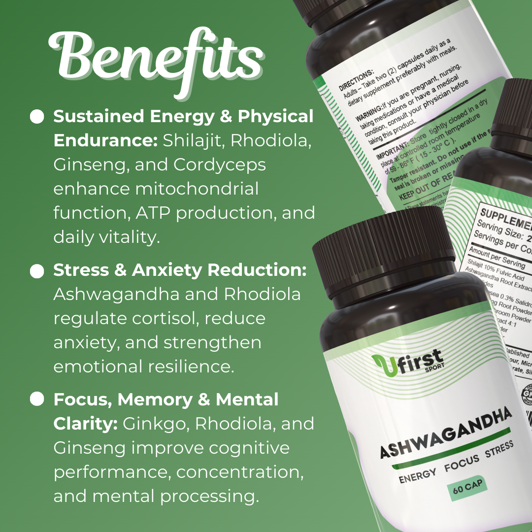 ASHWAGANDHA is an advanced adaptogenic formula designed to enhance daily energy, improve mental focus, and strengthen the body’s response to stress. This blend combines clinically supported plant extracts—Ashwagandha, Rhodiola, Ginseng, Cordyceps, and Ginkgo—along with Shilajit, turmeric, and nettle to deliver comprehensive support for physical, cognitive, and emotional performance.