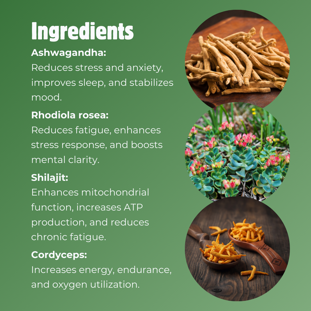 Sustained Energy Without Stimulants Shilajit, Rhodiola, Ginseng, and Cordyceps support cellular energy production and physical endurance.