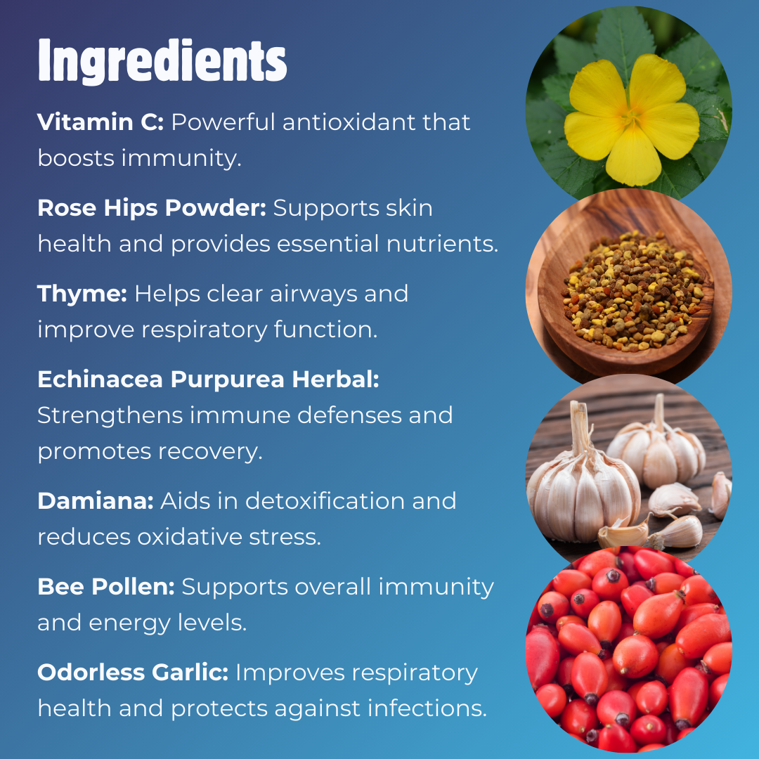 Boosts Immune Function: Vitamin C and bee pollen help strengthen the body's natural defenses.