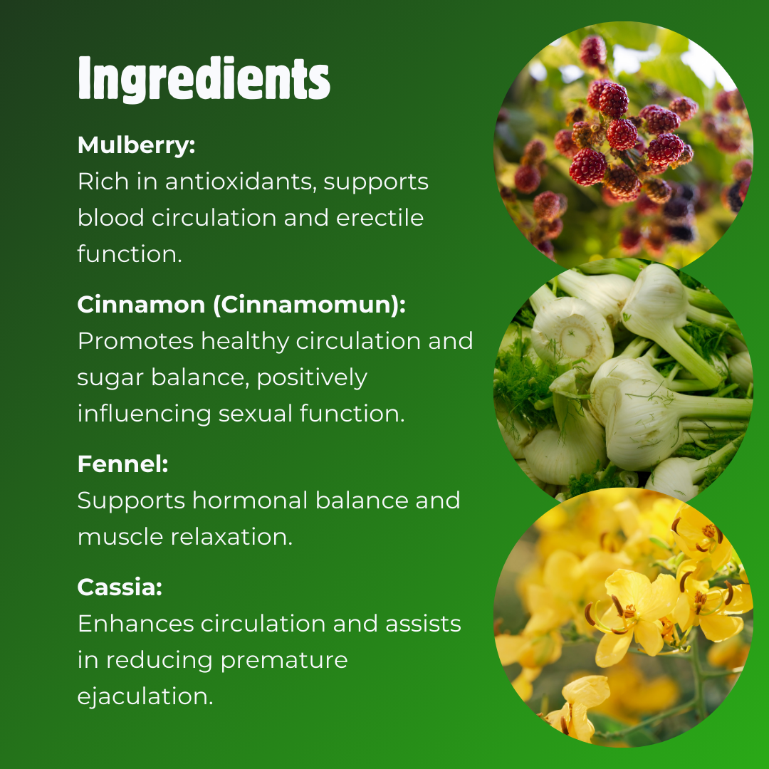 Cinnamon (Cinnamomun): Promotes healthy circulation and sugar balance, positively influencing sexual function.